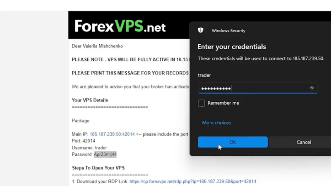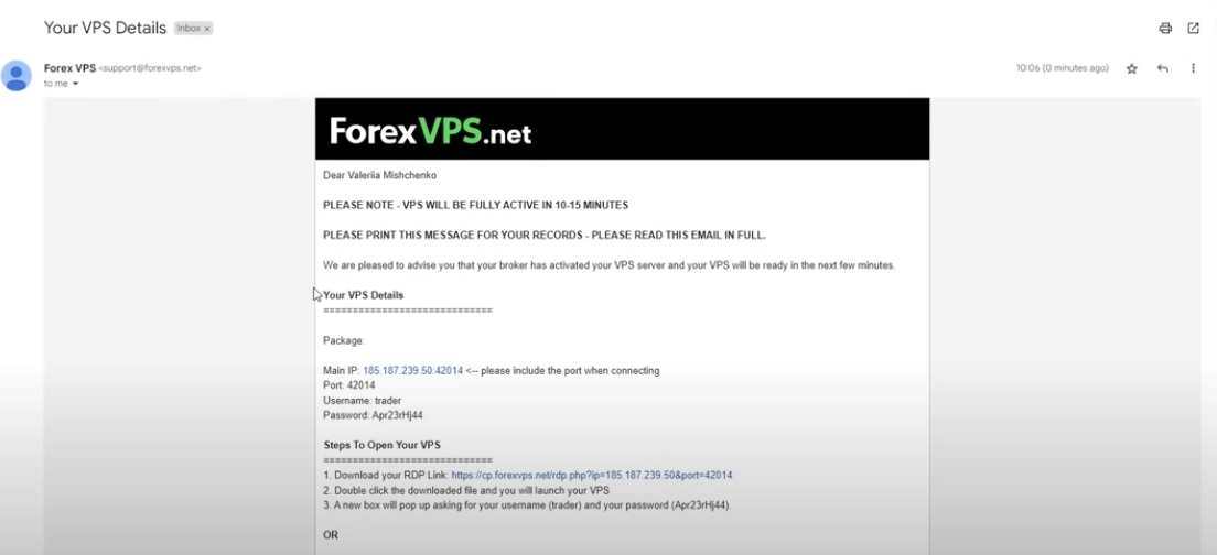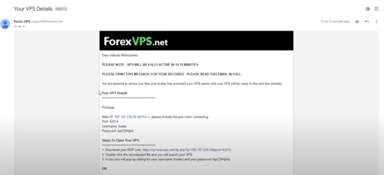 Once you complete the sign-up process through the onboarding form, your EasyVPS will be automatically set up. After we verify your broker account, you will receive an email from ForexVPS.net containing your login credentials and instructions on how to access your server.