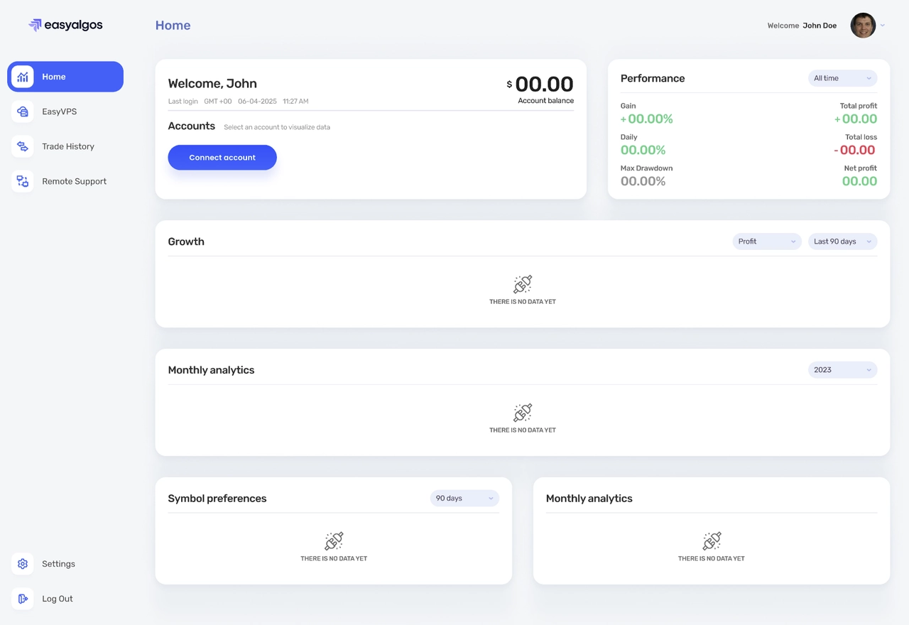 Once your account is verified, you will receive your EasyVPS login credentials, and gain full access to the user dashboard, where you can activate licenses, track performance, and manage your Expert Advisors.